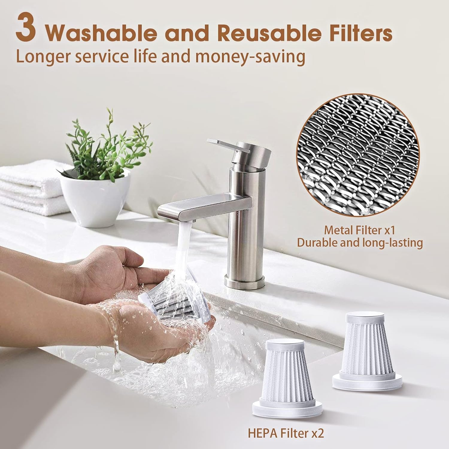 Comes with 3 filters: 1 durable metal filter and 2 HEPA filters. These filters are washable and reusable, ensuring long-lasting performance and cost savings. -