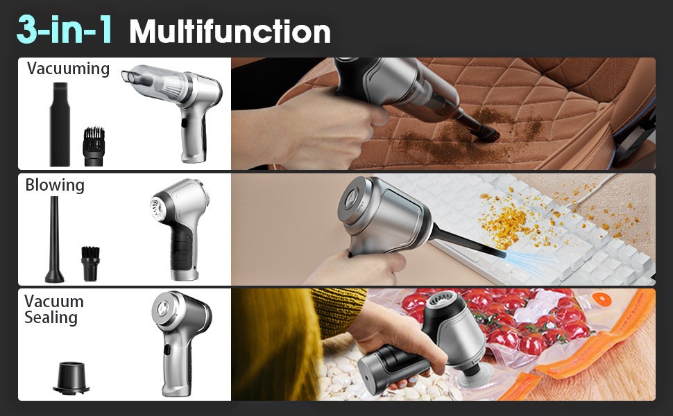 Switch between vacuum mode, dust blower mode, and vacuum sealing mode. Clean large surfaces, reach tight crevices, pump up balloons, or vacuum seal items—all with one device. -